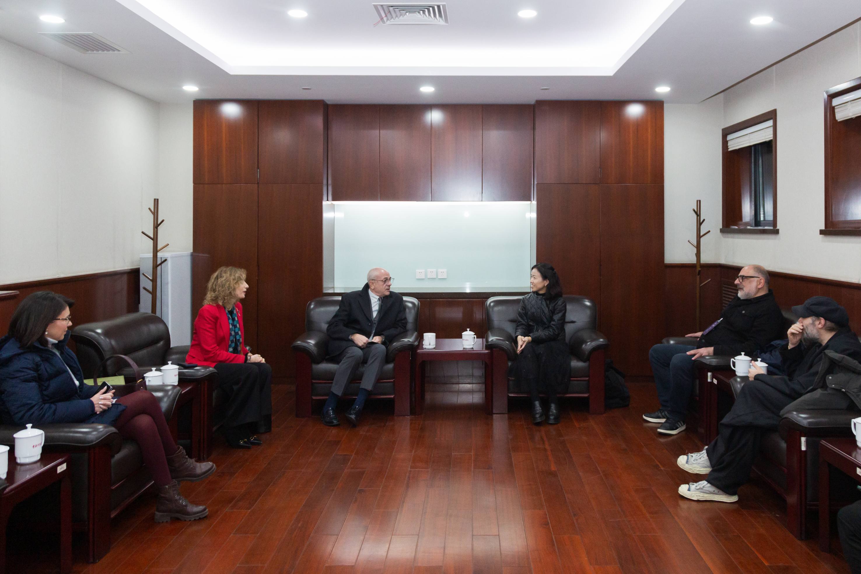 郝戎对沙鲁塔什维利一行的来访表示热烈的欢迎。他回顾了两校悠久的合作历史,对该校长久以来的支持表示感谢,期待延续优秀合作传统、探索创新合作机制。同时,郝戎,并对该校即将在世界戏剧教育联盟2025国际大学生戏剧展演上演出的剧目表示祝贺与期待。