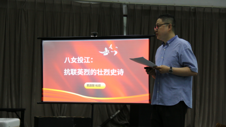 5月28日,学院电影电视系2023级广播电视节目主持班学生齐聚表导楼排练场,和音乐剧系2023级音乐剧表演班学生同上了一堂以“八女投江:抗联英烈的壮烈史诗”为主题的情境式思政课。本次课程由思政部党支部书记、副主任杜欣主讲,《八女投江》导演、音乐剧系范卫华教授,音乐剧系杨阳老师,思政部张瑜副教授、刘莹莹老师共同参与课堂指导。