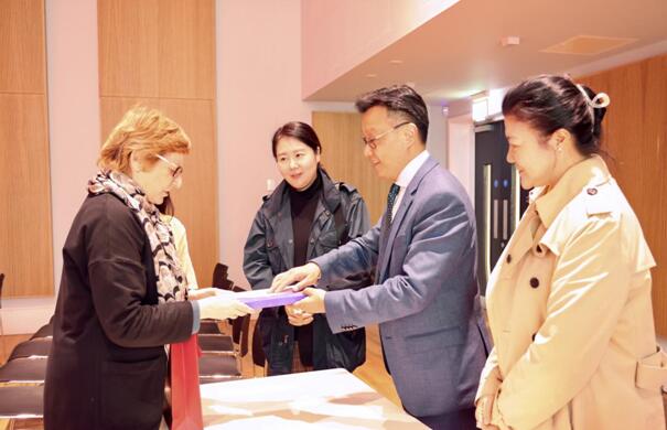 (歌剧系党总支书记石垒向爱尔兰皇家音乐学院长Deborah Kelleher赠送中戏礼品)