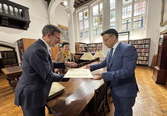(英国皇家音乐学院向石垒教授展示作曲家海顿珍贵手稿)