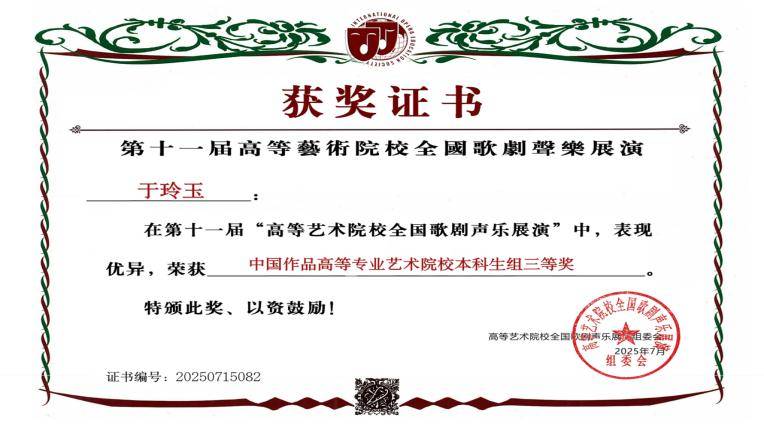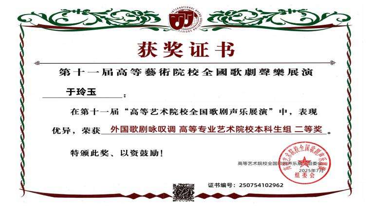 经激烈角逐、层层晋级,我院歌剧系多名学生在第十一届高等艺术院校全国歌剧声乐展演中脱颖而出,并取得傲人成绩。其中,2021级歌剧表演本科班于玲玉(指导教师:付茜)荣获高等专业艺术院校本科生组外国咏叹调二等奖、中国作品三等奖。歌剧系副教授付茜荣获优秀指导教师奖。