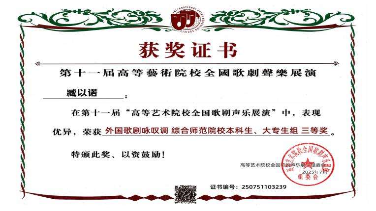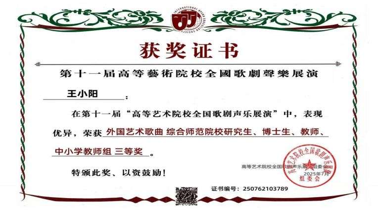 2024级硕士研究生王小阳(声乐指导教师:甘露露)荣获综合师范院校研究生、博士生、教师、中小学教师组外国艺术歌曲三等奖。歌剧系特聘教师甘露露荣获优秀指导教师奖。