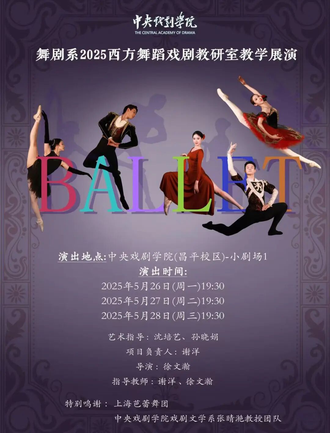 2025年5月26日至28日,中央戏剧学院舞剧系“2025年西方舞蹈戏剧教研室教学展演”于“昌平校区小剧场一”精彩上演。本次展演由2022级舞剧表演班全体学生担纲,作品涵盖古典芭蕾变奏、大双人舞、经典舞剧片段、国际赛事指定及原创现代芭蕾作品,并首次将中国民族芭蕾舞剧《白毛女》中“山洞相认”的经典片段搬上教学展演舞台,体现出教学内容的广度与学术视野的深度。
