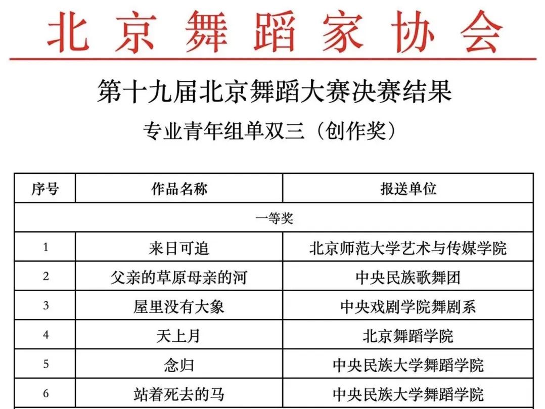 现代舞作品:《屋里没有大象》获2025北京市舞蹈大赛表演一等奖、创作一等奖,2024韩国首尔国际现代舞比赛特别奖,2024韩国国际现代舞大赛金奖;《无间》获第13届桃李杯现代舞青年男子组优秀表演人才奖;《何处惹尘埃》获第13届桃李杯优秀作品奖;《成人的游戏》获维杰布斯克国际编舞比赛大奖。