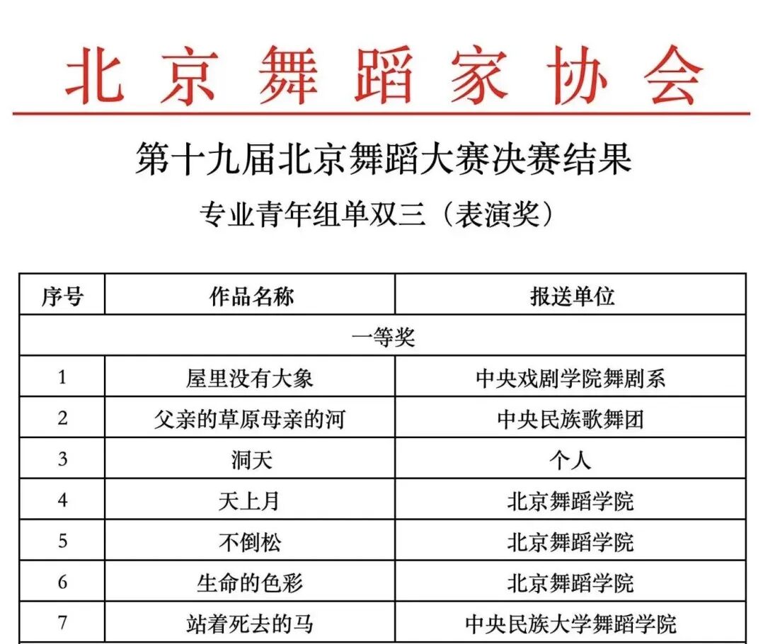 由中央戏剧学院舞剧系青年教师刘美池编创、舞剧系2020级舞剧表演班马驰表演的独舞《屋里没有大象》,在决赛中荣获专业青年组单双三“创作奖”和“表演奖”两项大奖,实现了舞剧系在该赛事中“双一”零的突破。