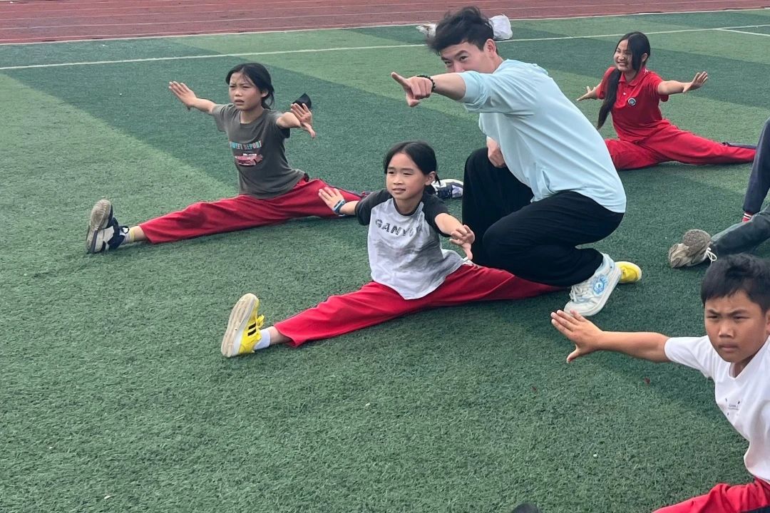 谢易霖帮助马路中心小学地戏班的孩子们学习京剧基本功。跑圆场、压腿、踢腿、压体前屈、打赞子、打飞脚、弹跳训练、身体协调性训练……烈日炎炎下,汗水浸透衣衫,他始终秉持安全第一、稳扎稳打的理念,做好每一次训练。令人欣喜的是,在他的悉心指导下,孩子们最终都能标准地完成对柔韧性要求极高的“下叉”动作,为地戏表演打下了坚实的身体基础。