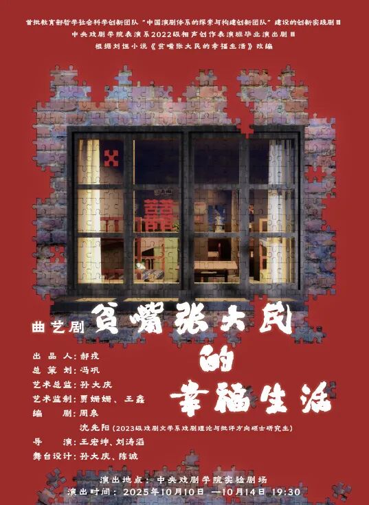 10月10日—14日,首批教育部哲学社会科学创新团队“中国演剧体系的探索与构建创新团队”建设的创新实践剧目、中央戏剧学院表演系2022级相声创作表演班毕业演出剧目曲艺剧《贫嘴张大民的幸福生活》将在实验剧场上演。