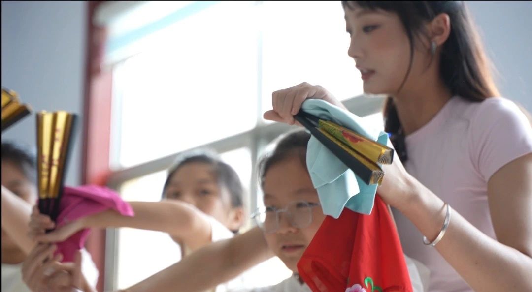 此外,京剧系程钰鑫同学开展儿童京剧体验课程,包括基础身段训练和《卖水》片段练习,同时将京剧元素融入儿童剧的排演创作中,带孩子们通过戏曲精神理解中华文化的精髓,从而增强文化自信。