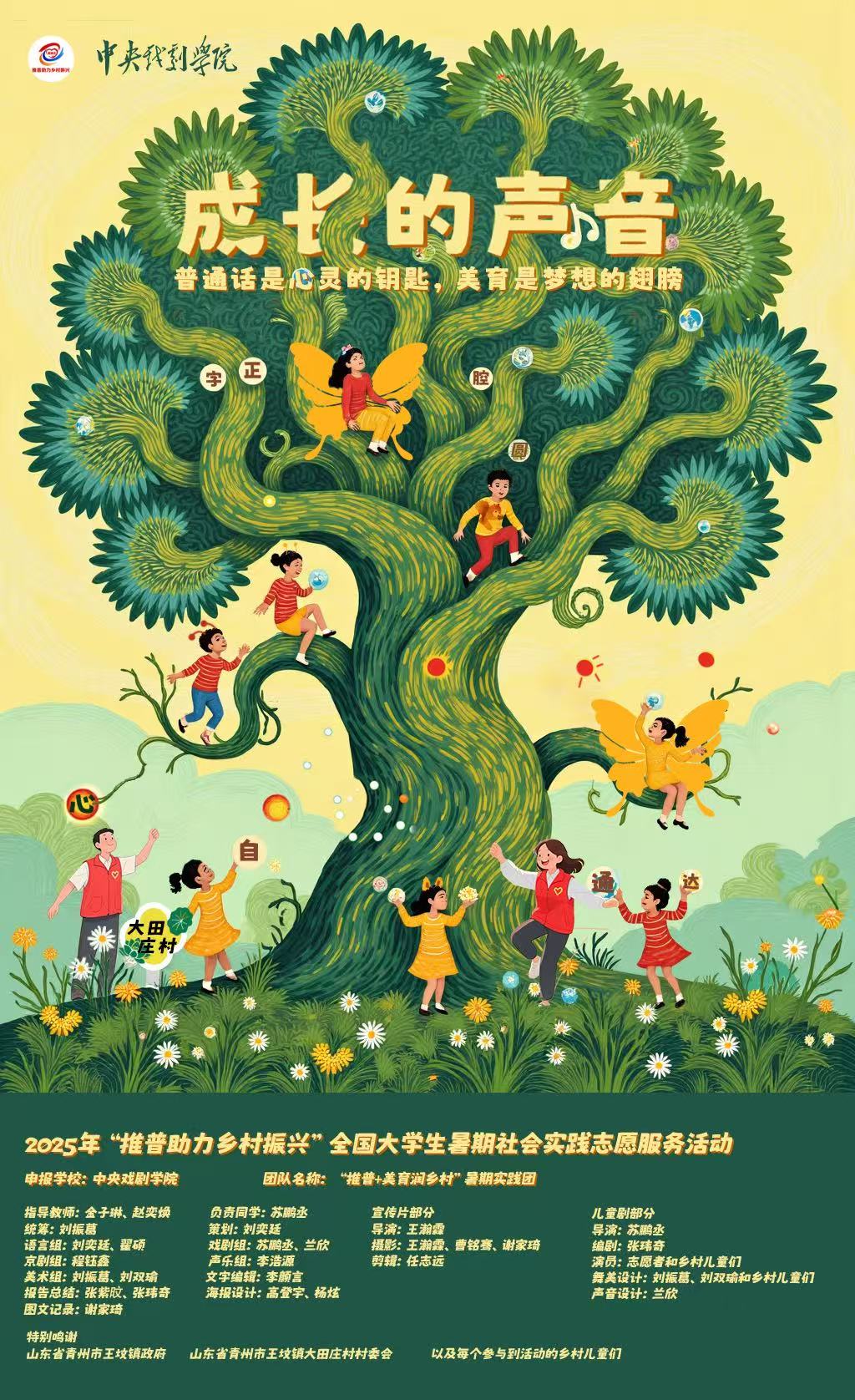 为深入贯彻党的二十大和二十届二中、三中全会精神,落实习近平总书记在全国教育大会上的重要讲话和关于语言文字的重要指示批示精神,按照教育部语言文字应用管理司和共青团中央青年发展部工作要求,中央戏剧学院青年学子于7月11日至18日,在山东省青州市王坟镇大田庄村开展了为期八天的“推普+美育润乡村暑期实践活动”。