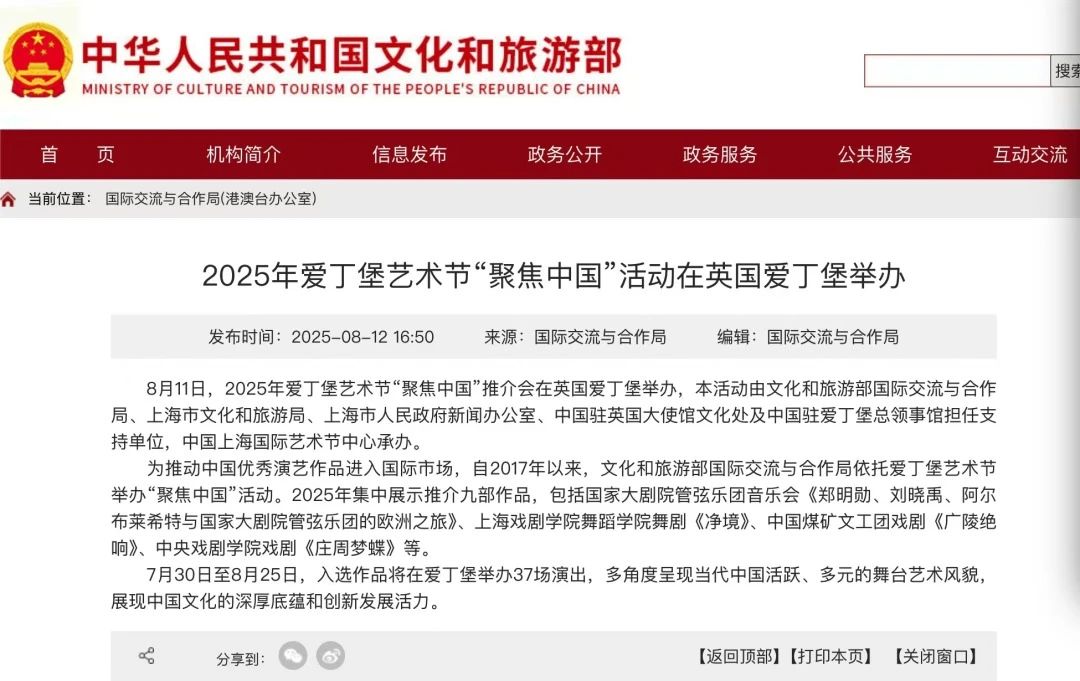 该剧入选由文化和旅游部国际交流与合作局、上海市文化和旅游局、上海市人民政府新闻办公室、中国驻英国大使馆文化处及中国驻爱丁堡总领事馆支持,中国上海国际艺术节中心主办,上海城世品牌发展中心协办的2025年爱丁堡艺术节“聚焦中国”项目。国务院新闻办公室、文化和旅游部官网、人民日报、东方卫视等国内外百余家媒体对此进行了报道。