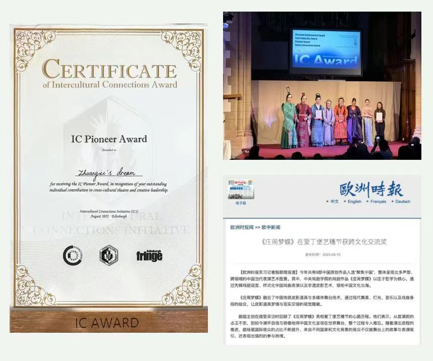 《庄周梦蝶》在2025爱丁堡艺穗节备受国际关注,凭借其独特的东方美学与哲思表达,荣获“IC先锋剧目奖”(IC Theatre Innovation Award),由尼日利亚埃蒂奥尼王国女王安杰丽克·莫奈亲自颁发这一殊荣,《欧州时报》进行了报道,将该剧誉为“最能唤起文化好奇心的中国剧目”。该剧还入选艺穗节官方推荐板块,登上《The List》杂志重点推介,成为本届“中国剧目年度必看”。英国多家专业剧评媒体给予高度评价,其中 Lothian Life 与 Morning Star 打出四星评价,Sound Behind Curtain 与 Scottish Field 更给予五星盛赞。作品不仅彰显中国青年创作力,也在国际舞台上传递出强烈的文化自信。