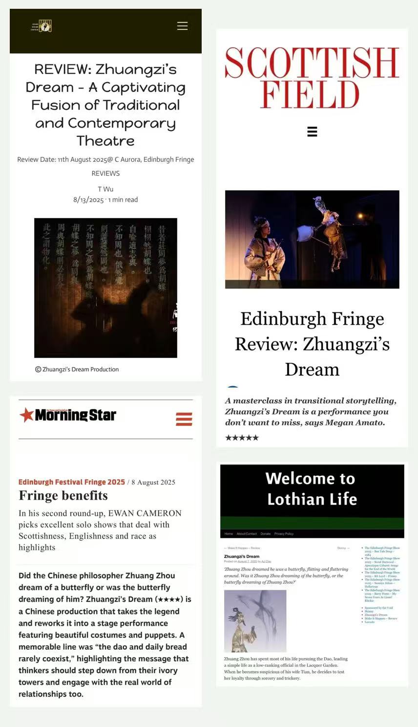从演员走上爱丁堡街头,到剧场内连日爆满的演出热潮,从各大主流媒体竞相报道到荣获艺穗节奖项,话剧《庄周梦蝶》是中国青年艺术走向世界舞台的生动范例,也展现了中国戏剧在国际文化交流中日益增强的美学力量与叙事主动性。