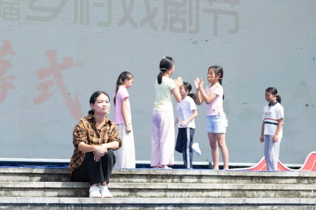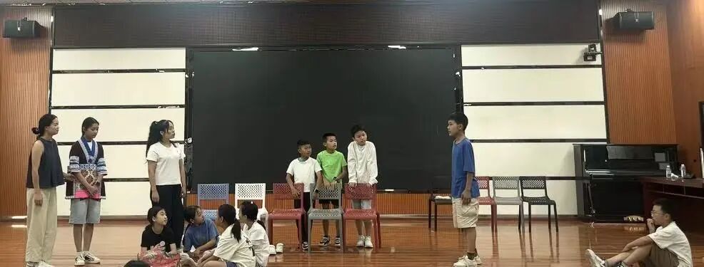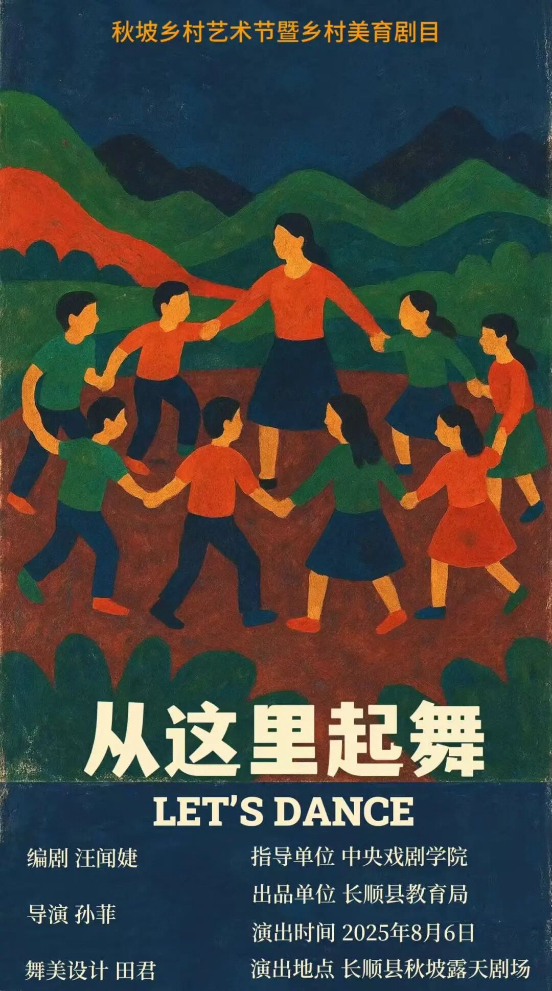 7月20日起,《从这里起舞》在贵州省长顺县第三小学正式展开排练,并于8月6日登上秋坡艺术节舞台。这部作品是中央戏剧学院第四期“戏剧教学法应用于学科教学”长顺专项师资培训的延续项目。由前期师资培训中遴选出的优秀教师继续深耕,约20位来自县、乡、镇的教师与学生共同组成了演员团队。他们此前从未接受过戏剧训练,却在短短13天内完成了一部原创舞台剧的排练与呈现。这不仅是一次剧目创作,更是一场乡村美育的在地化探索。