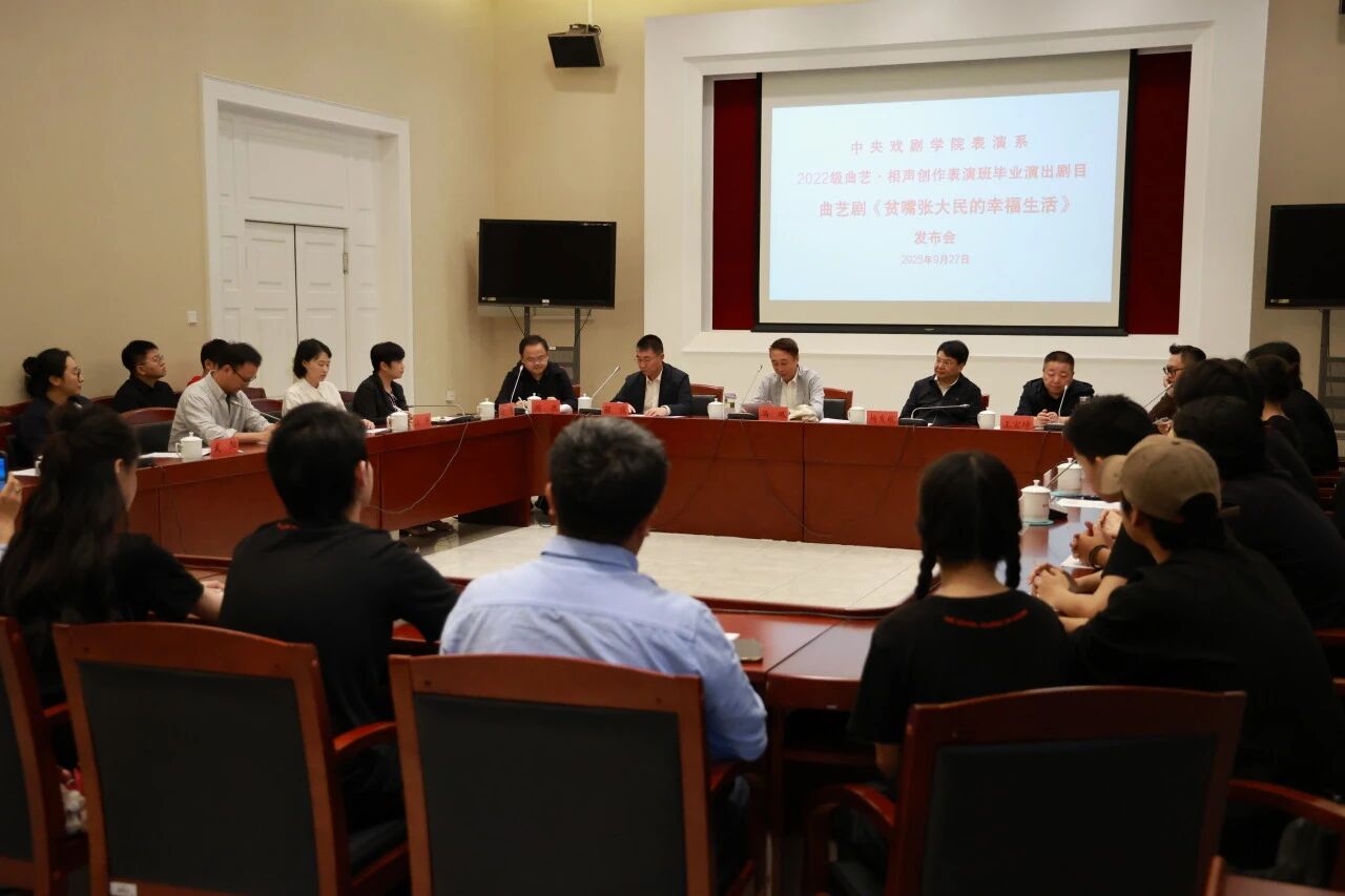 9月27日,中央戏剧学院表演系2022级曲艺(相声创作表演)班毕业演出剧目曲艺剧《贫嘴张大民的幸福生活》发布会在东城校区剧场东厅举行。中国文联副主席、中国曲艺家协会主席、著名表演艺术家、中央戏剧学院表演系2022级曲艺(相声创作表演)班主讲教师冯巩,中国曲艺家协会书记、驻会副主席杨发航,中央戏剧学院院长郝戎、实验剧团团长孙亮,该剧导演、中国广播说唱团团长王宏坤和大笑工坊创始人刘涛滔,该剧制作人、中央戏剧学院实践教学中心江丹,以及该剧主创团队和学院职能部门代表出席发布会。因事未能到会的原著作者、著名作家刘恒和该剧舞美设计孙大庆教授表达了对于该剧的祝贺和期望。会议由该剧编剧、中央戏剧学院戏剧文学系副主任、曲艺专业负责人周泉主持。