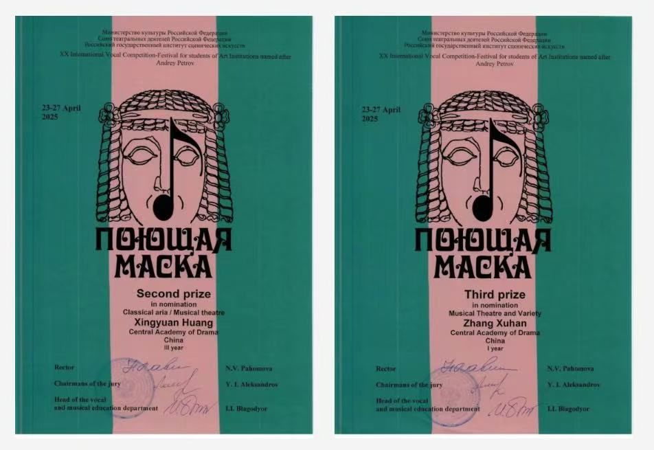 近日,第二十届安德烈·彼得罗夫“歌唱面具”国际声乐比赛公布结果。经国际评委会评审,音乐剧系学生黄星羱凭借《绝不可以》荣获音乐剧类别二等奖,张煦晗凭借《长腿叔叔》荣获音乐剧类别三等奖。此次获奖不仅展现了我院学生的专业实力,更在国际舞台彰显了中国音乐剧的独特魅力。