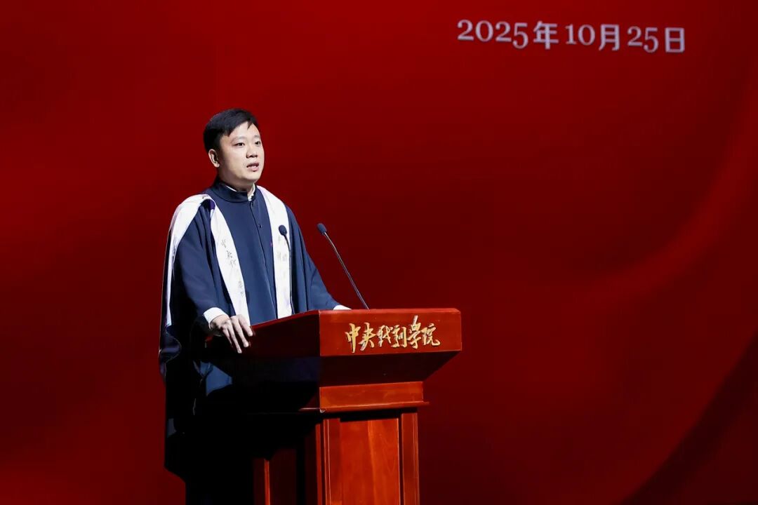 校友代表戏剧教育系2016级戏剧教育班栾欣钰在发言中,深情回顾了自己从中戏学子到中国传媒大学教师的身份转变,她表示:“母校教会我们的不仅是专业技能,更是做人做事的根本。‘求真、创造、至美’的校训至今仍是我从教路上的精神灯塔。”音乐剧系2019级研究生于佳鑫在发言中表示,是母校给予了她应对纷繁世界的“方法论”,要用“求真”的态度对待每一次创作,用“创造”的勇气面对每一个挑战,用“至美”的追求打磨人生的每一个细节。这份教导,让她在离开校园后,不迷茫,不浮躁,依然能清晰准确地找到自己的坐标。