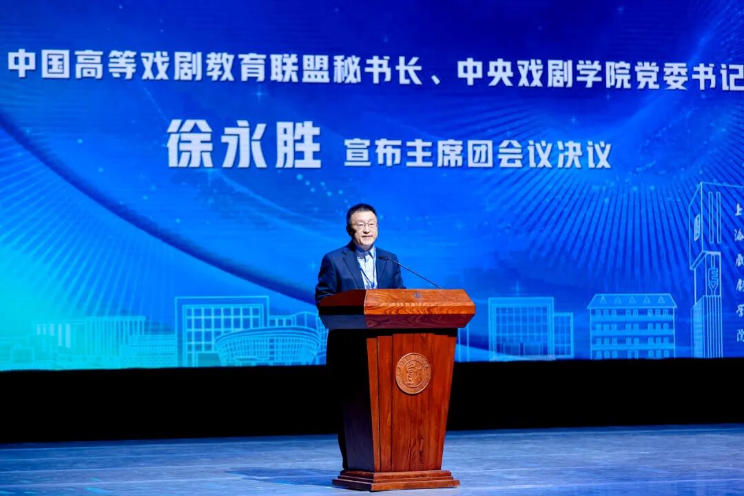 徐永胜代表联盟致闭幕词。他首先对精心策划和组织本次活动的上海戏剧学院,以及参加活动的所有嘉宾、专家学者和师生表示由衷的感谢。他表示,在这精彩的三天时间,中国高等戏剧教育联盟召开了卓有成效的主席团会议,与会专家学者立足戏剧艺术教育提出深刻见解,大学生戏剧展演全面展现了青年学子融合与创新的戏剧探索,彰显了中国艺术教育事业的蓬勃生机和联盟的新时代价值与活力。站在建设教育强国的新征程上,中国高等戏剧教育联盟作为教育战线、文化战线的重要力量,将坚持走好“两创”实践之路,突出中华优秀传统文化的人民性、经典性、包容性和丰富性,将联盟打造成为习近平文化思想的生动实践地。