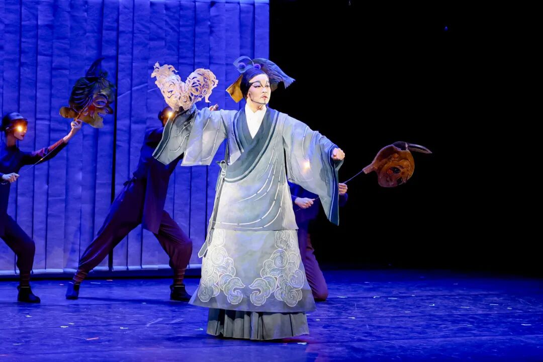 本届大学生戏剧展演的主题是“融合与创新”。联盟总部办公室共收到剧目23部,经过两轮专家评审,最终10所国内知名高校的精彩戏剧作品片段在上戏端钧剧场、黑匣子剧场上演。李珊同时受邀担任展演评委。由学院导演系葛袁亮副教授带领学生作为主创团队的剧目《庄周梦蝶》获得热烈反响。该剧以《庄子》的哲学思想为内核,重构战国末年漆园小吏庄周“试妻劈棺”的荒诞寓言,展开一场关于执念与逍遥、真实与虚幻的终极思辨。全剧大量运用皮影和偶来表现梦境、回忆和想象,演员的表演融入了戏曲的身段、步法和程式化的表演方式,构筑出东方美学的独特意境,在“融合与创新”中展现了学院扎实的人才培养成效。