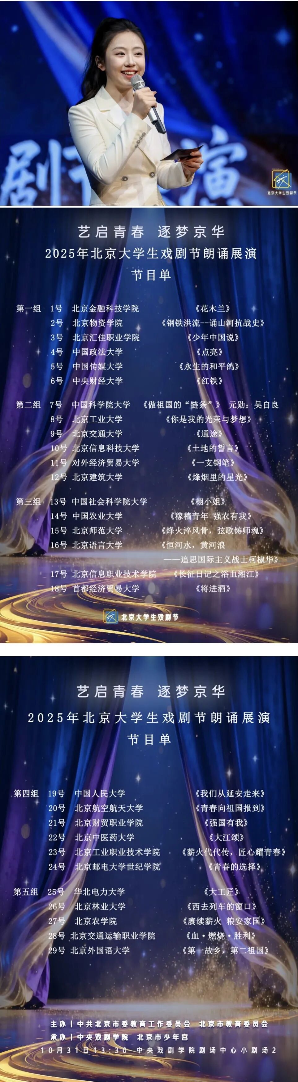 10月31日,2025年北京大学生戏剧节朗诵展演在中央戏剧学院昌平校区剧场中心圆满落幕。作为戏剧节首个亮相的核心板块,本次展演由中共北京市委教育工作委员会、北京市教育委员会主办,中央戏剧学院与北京市少年宫联合承办,以“育人为本、面向人人、资源共享、特色创新”为核心原则,汇聚29所首都高校的学子,用朗诵为笔,书写青春与信仰,为首都教育高质量发展注入鲜活的艺术力量。本次活动是认真贯彻落实《教育部关于全面实施学校美育浸润行动的通知》精神,深入推进《北京市全面实施学校美育浸润行动工作方案》落地见效的生动实践。