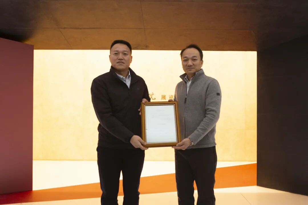 北京中央戏剧学院教育发展基金会秘书长平睿向北京师范大学教育基金会副秘书长赵铁峰颁发了捐赠证书