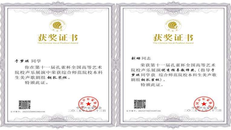 2021级歌剧表演本科班徐彬(指导教师:王旭鹏)、2022级歌剧表演本科班邓裕蓁(指导教师:刘珊)分别荣获综合师范院校本科生美声歌剧组优秀奖。