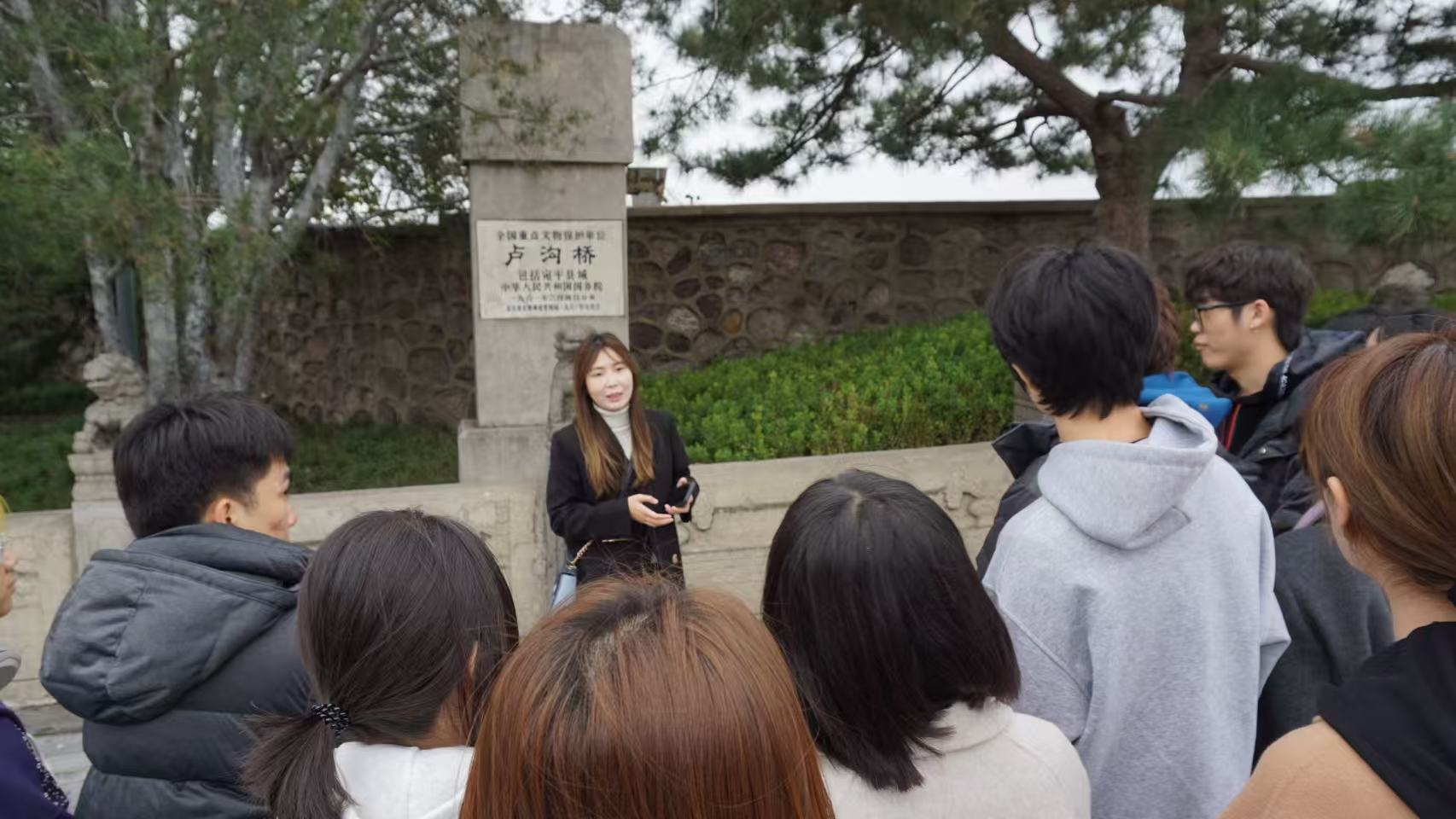 随后,师生一行前往卢沟桥开展实地教学。青石桥面被岁月打磨,桥上石狮静静伫立,仿佛仍在诉说枪声惊天的那个夜晚。面对滔滔永定河水,张瑜带领学生回溯卢沟桥事变的历史节点,感悟民族危亡时刻无数青年挺身而出的英勇气概。许多同学在石碑前默默驻足,眼中闪烁着沉思与敬意。