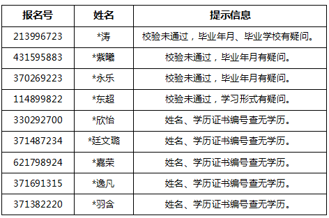 以下学历检验未通过的考生,本人信息填写错误的,请务必尽快修改填报信息或提交相应材料。无学籍学历信息的请提交相关证明,如:教育部留服中心认证报告、网络教育及自考应届、境外应届考生承诺书、改名考生身份及学籍学历证明等。不及时修改或无法提供者,将不予确认、不予准考。