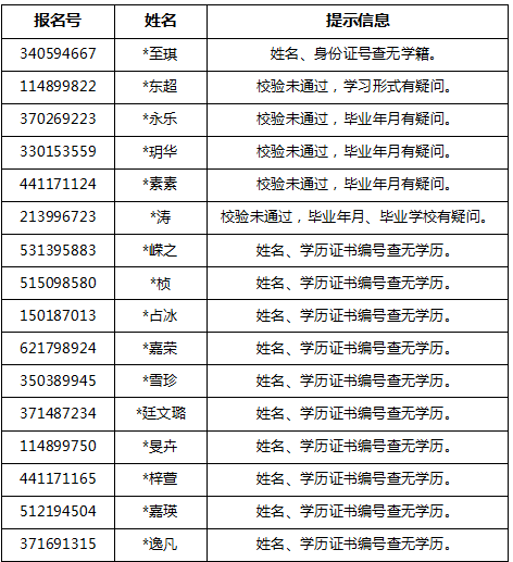 以下学历检验未通过的考生,本人信息填写错误的,请务必尽快修改填报信息或提交相应材料。学籍学历信息的提示不通过的请提交相关证明,如:教育部留服中心认证报告、网络教育及自考应届、境外应届考生承诺书、改名考生身份及学籍学历证明等。不及时修改或无法提供者,将不予确认、不予准考。