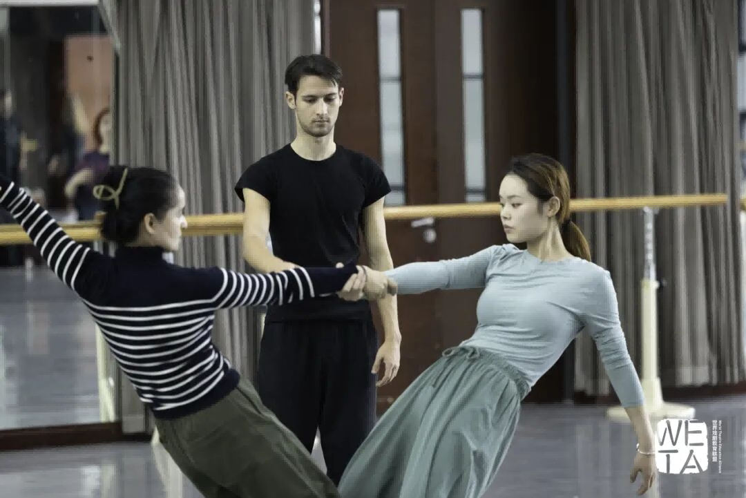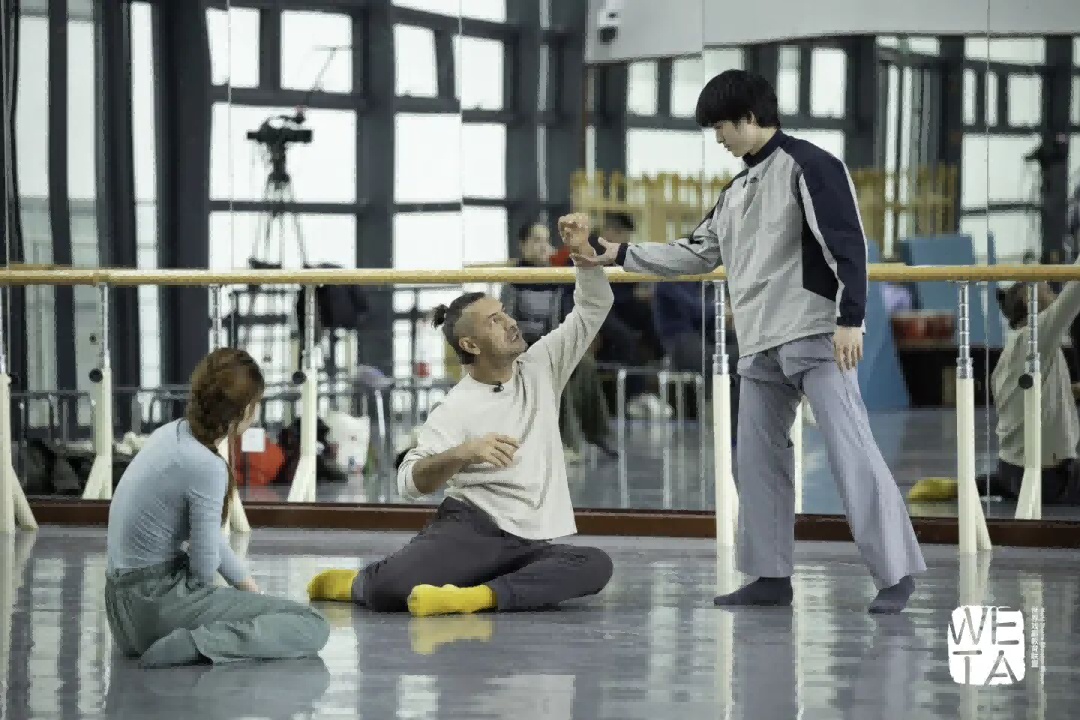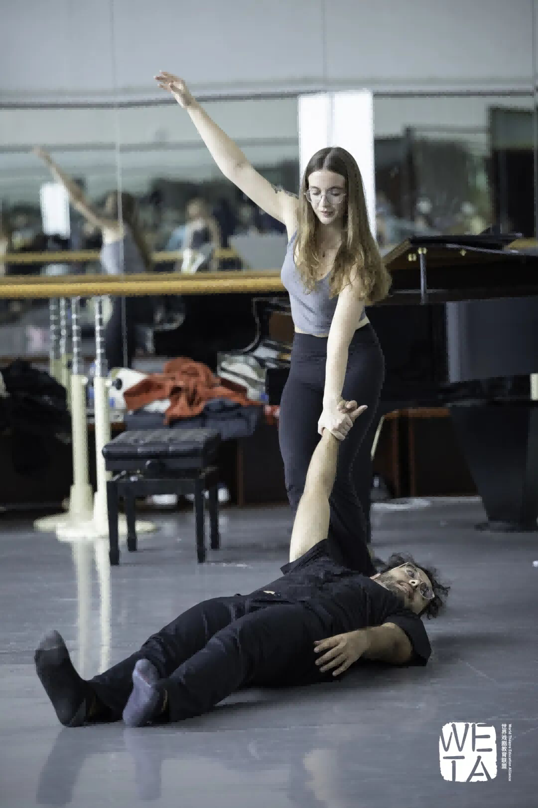 In the second session, using the same "demonstration-and-practice" approach, Prof. Mandzhukov organised the participants into groups to build upon the solo work. He gradually incorporated more interaction and continuity to explore the communicative elements of a duet. The progression from solo emotional expression to a pas de deux depicting Romeo's discovery of his seemingly lifeless love demanded a more rigorous emotional logic in the choreography and a heightened chemistry between partners. This development rapidly intensified the characters' emotional state, adding layers of complexity to the movements' initiation points and flow. Throughout this process, Prof. Mandzhukov moved actively among the participants, offering detailed and targeted instruction to each one. Particularly impressive was his physical portrayal of and conceptual approach to the image of "death." For instance, to help the actor portraying Romeo's grief and bewilderment, Mandzhukov designed a movement where Romeo drags Juliet's body. By stabilising the hip joint and generating force from the core and knees, the actor playing Romeo could achieve a precise, grief-stricken backward-leaning posture. For the actor playing the "seemingly dead" Juliet, the professor instructed them to consciously control which muscles to engage and which to relax—using relaxed arms to assist their partner in applying force and coordination, while keeping the rest of the body tense to replicate the rigidity of a corpse. This technique captured the despair of Shakespeare's tragic scene.